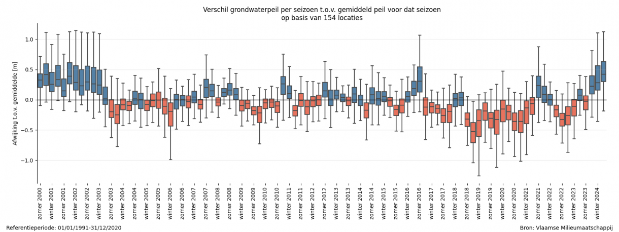 Figuur 4 toont de verdeling van de verschillen (op 154 locaties) tussen het gemiddeld grondwaterpeil voor elk individueel seizoen t.o.v. het gemiddeld peil per seizoen in de referentieperiode. Deze grafiek toont hoeveel hoger of lager dan normaal de peilen in een bepaald seizoen waren (voor dat seizoen in de referentieperiode). In de lente van 2024 was de gemiddelde grondwaterstand voor de mediane meetplaats ruim 40 cm hoger dan normaal in de lente. In de periode 2017-2020 was de seizoensgemiddelde grondwaterstand voor de mediane meetplaats meestal enkele tientallen centimeter lager dan normaal. In de natte periode 2000-2002 was de seizoensgemiddelde grondwaterstand voor de mediane meetplaats enkele tientallen centimeter hoger dan normaal.