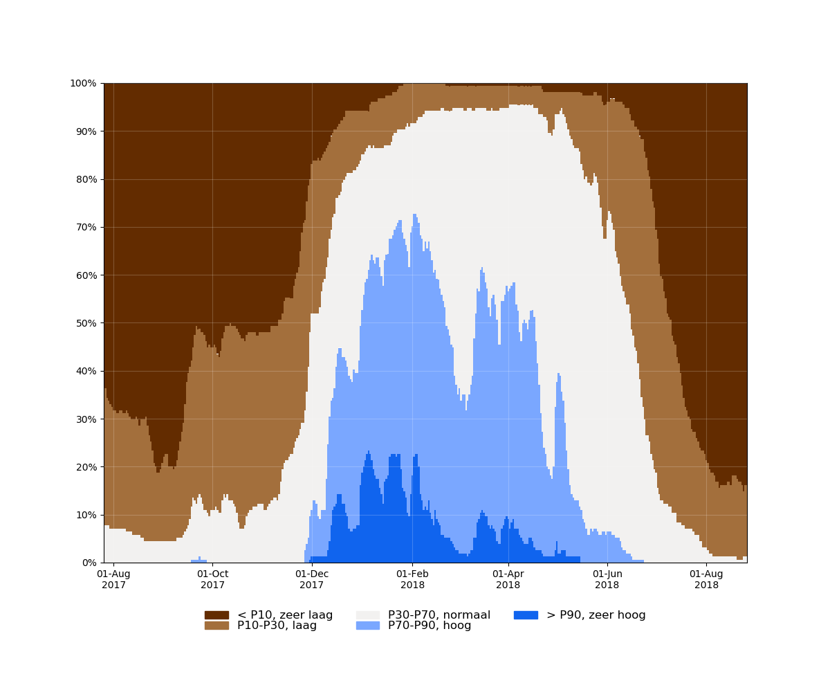 Figuur 1: Relatieve toestand van de grondwaterstand (2017-07-26 tot 2018-08-26): % van de meetplaatsen met een zeer lage, lage, normale, hoge of zeer hoge grondwaterstand