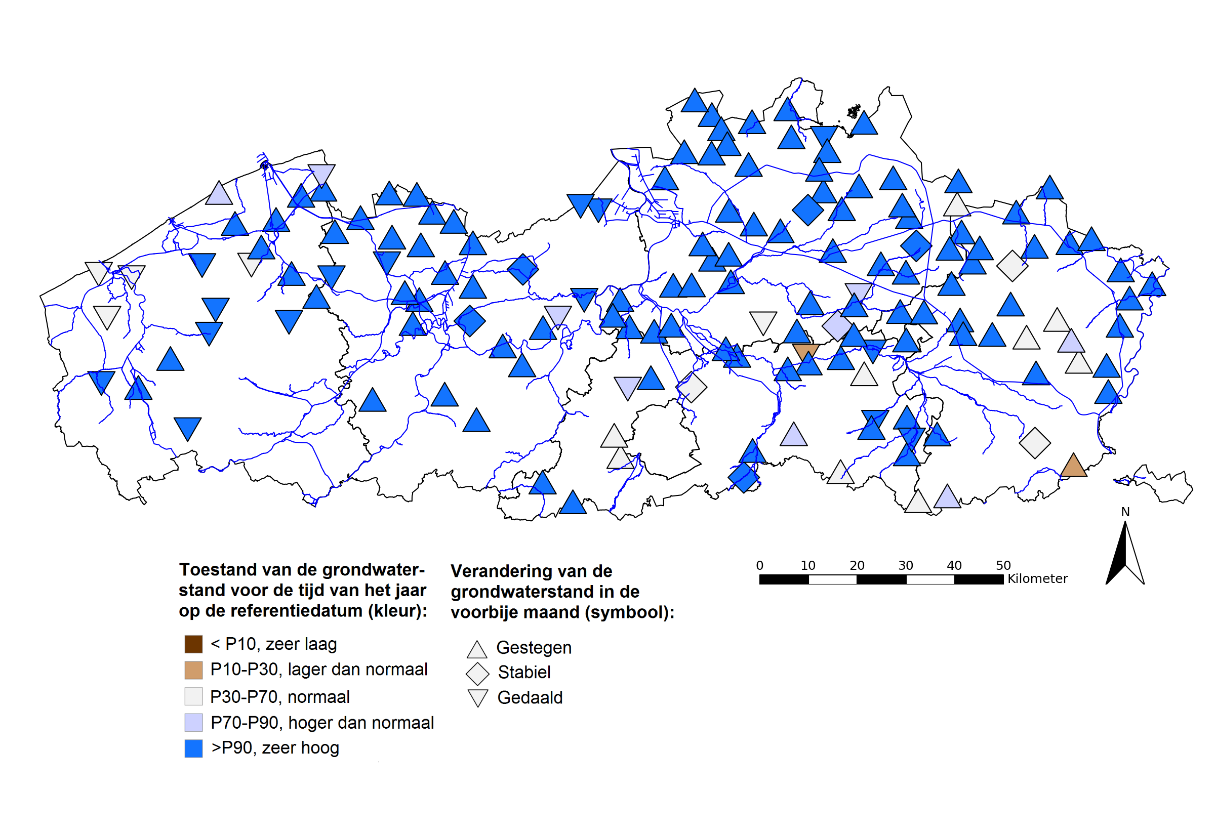 Zeer hoge grondwaterstanden zijn over bijna heel Vlaanderen verspreid. Normale of hoger dan normale grondwaterstanden zijn meer aanwezig aan de kust, rond Brussel, in het zuidoosten van Vlaanderen en op het Kempens plateau. De grondwaterstanden zijn in Limburg en in de Kempen bijna overal gestegen. In het zuidwesten van Vlaanderen zijn de grondwaterstanden vooral dalend. Tussen deze twee gebieden is het beeld genuanceerder, de grondwaterstanden stijgen vooral met daartussen dalende of stabiele grondwaterstanden.