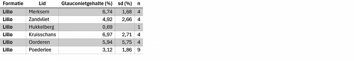 Het glauconietgehalte van de Antwerpse Lillo Formatie varieert doorgaans tussen 6 en 12 %, met waarden tot 20 % in het Luchtbal Lid (Louwye et al., 2020b). Het gemeten glauconietgehalte in de fractie 63µm-1mm bedraagt 5,9 ± 5,7 % in het Oorderen Lid, 7,0 ± 2,7 % in het Kruisschans Lid, 6,7 ± 1,7 % in het Merksem Lid en 4,9 ± 2,7 % (Figuur 2). Het glauconietgehalte in het Poederlee Lid bedraagt 3,1 ± 1,9 %.